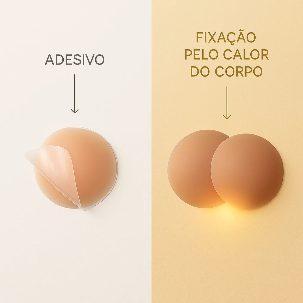 Nossos protetores de mamilo são feitos de silicone 100% de grau médico , que adere ao calor natural da sua pele . Sem cola, sem enrolar. E quanto mais quentes, melhor seguram . Então, sim: eles são seus companheiros perfeitos para dias intensos, climas quentes ou treinos intensos.